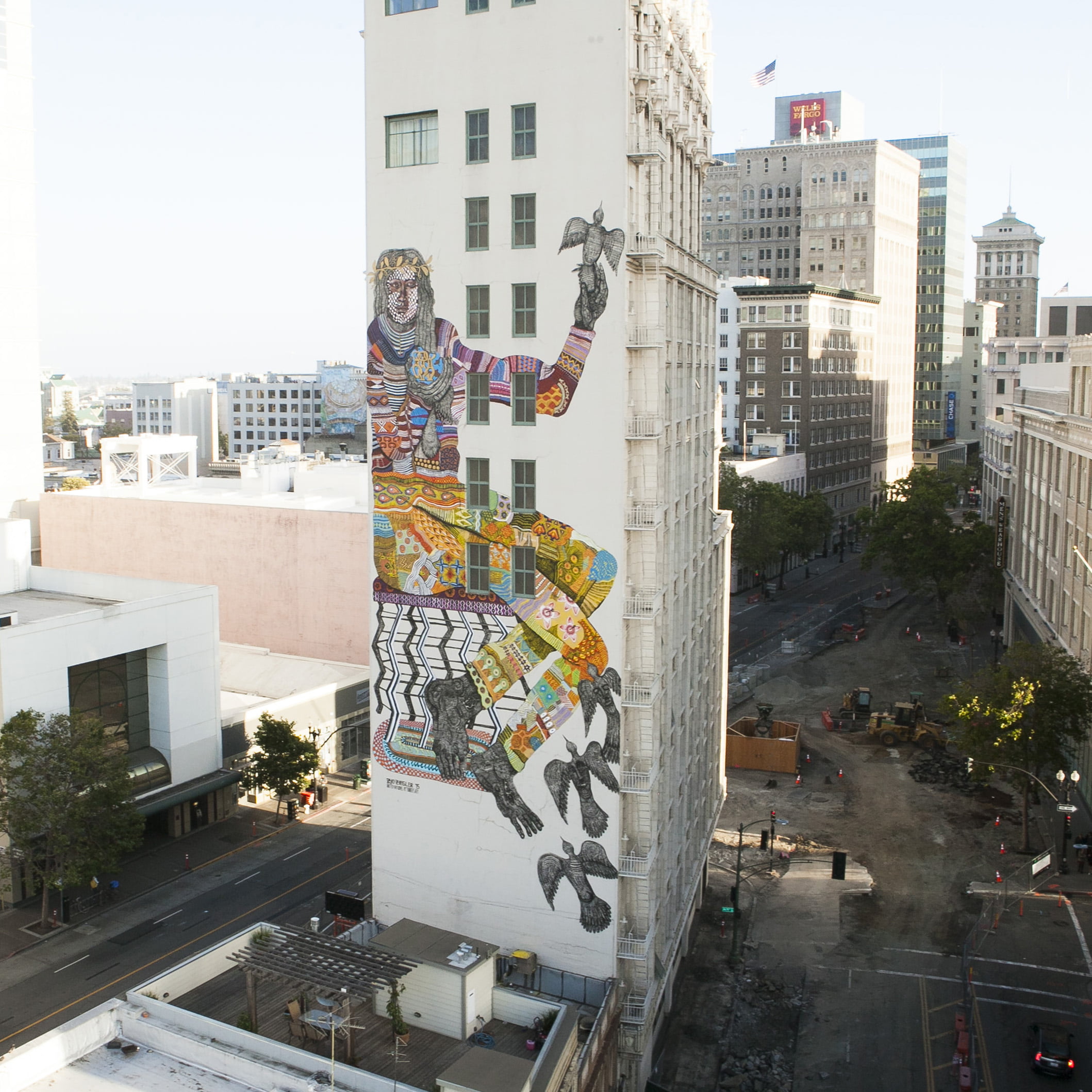“The lift actually wouldn’t extend all the way. There was a technical error. So in the time I had to paint that morning, I would paint what I could reach. The feet, the legs, and those birds.”