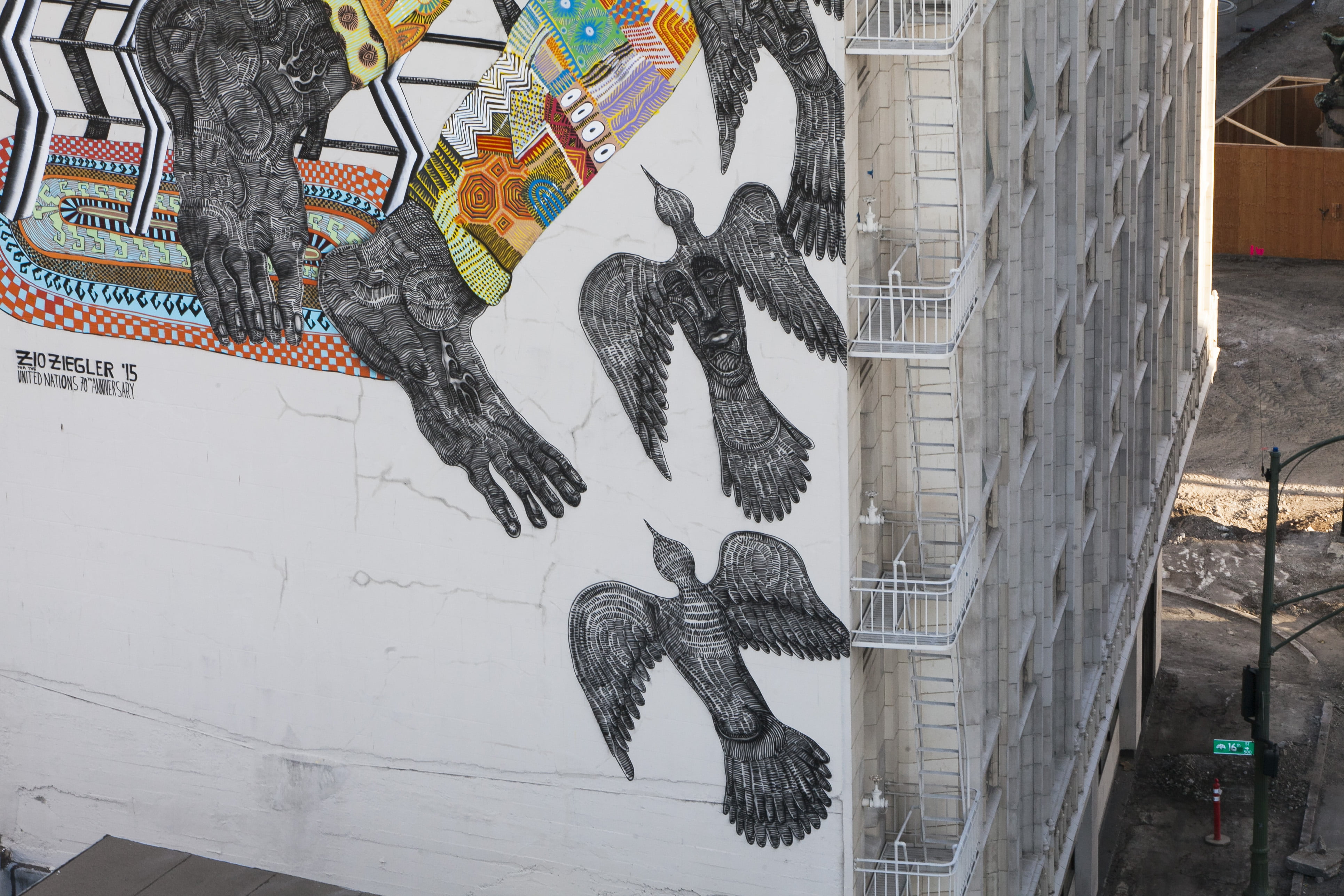To commemorate the event the artist Zio Ziegler painted a huge mural in downtown Oakland. His work was created to both honor the ideals of the United Nations and reflect the 17 Sustainable Development Goals, which the United Nations will set as its key international development targets for the next 15 years.